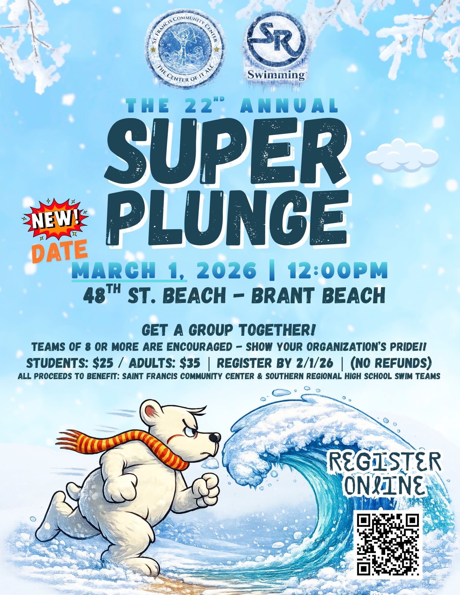 The Super Plunge is a spirited winter tradition that combines community, courage, and giving back. Participants take a refreshing plunge into the ocean while raising vital funds to support programs at the St. Francis Community Center and the Southern Regional High School Swim Teams.
